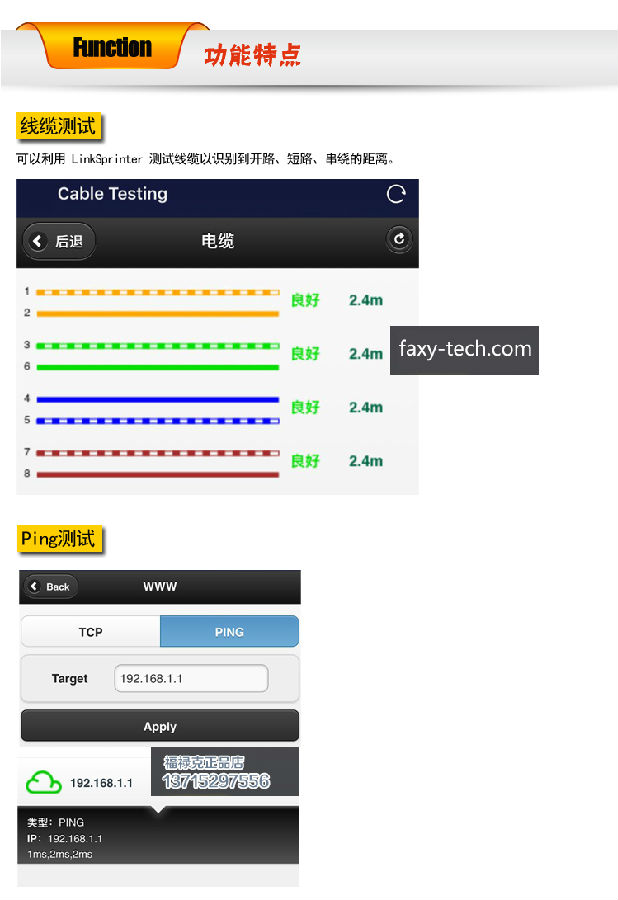 可以利用 LinkSprinter 測試線纜以識別到開路、短路、串繞的距離。