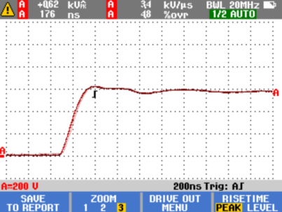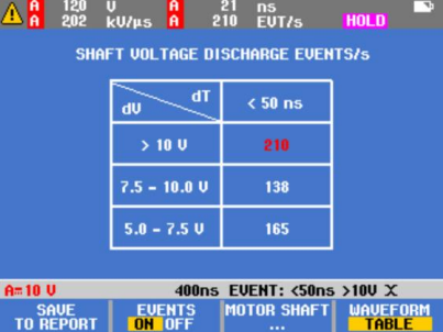 運用脈衝寬度調製信號的測量值來檢查可能對電機繞組絕緣造成損壞的高電壓峰值。脈衝的上升時間或陡度通過 dV/dt 讀數(一定時間內的電壓變化率)來表示,此讀數應與電機規定的絕緣值進行比較。這些測量值還可以用於確定開關頻率,以判斷信號發生上下浮動的電子開關或接地是否存在潛在的問題。