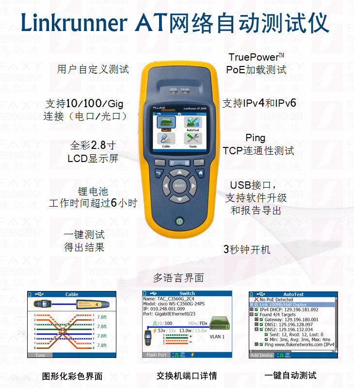 主要功能包括在 10/100/1G 速度下通過銅纜和光纖檢驗信號和鏈路完整性、一流的 TruePower PoE 測試和負載、802.1x 認證,電纜布線、IPv4/IPv6 就緒狀況、簡潔的用戶界麵和顏色顯示、測試結果的詳細記錄並存儲 50 份報告、線路位置與識別以及最近的交換機信息。