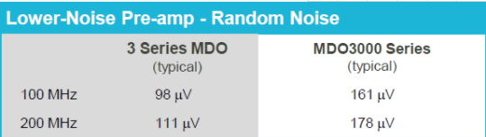 測量微小信號時,為獲得更佳的測量精度,降低儀器的本底噪聲至關重要。3 係列 MDO 中使用的全新前端設計有助於您將噪聲測量精度提升高達 40%。評估示波器時,請務必仔細檢查示波器的隨機噪聲技術規格。示波器各不相同,且並非所有示波器製造商均會測試和發布其隨機噪聲規格。