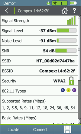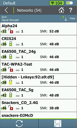 快速查看在現場環境中所有的網絡並查看每一網絡的關鍵參數,其中包括信號強度、信噪比、安全類型以及接入點的數目。發現常見的問題例如混合的安全種類、信號覆蓋差或沒有輔助 AP 覆蓋等等。