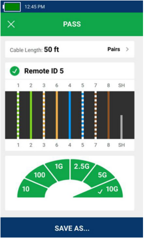 連接了遠端單元的線纜測試顯示遠端ID 5,長度和電纜編號以及線纜性能,高達10 Gb/s