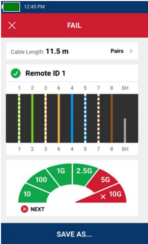 連接了遠端單元的線纜測試顯示遠端ID 1,長度和電纜編號以及線纜性能,高達1 Gb/s,但由於用戶設置的性能限值為10 Gb/s 而未能通過測試。