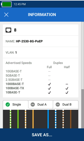 除了強大的線纜測試功能外,LinkIQ 還提供所連接的最近交換機的詳細信息。LinkIQ 與交換機協商以識別設計數據速率( 高達10GBASE-T)、半/ 全雙工標識、交換機名稱、端口號和VLAN 信息。