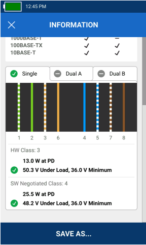 為簡化PoE 安裝及其故障診斷和排除,LinkIQ 顯示供電的線對,包括不同的功率水平以及用於雙重簽名的線對。此外,LinkIQ 實際上會在連接上施加負載,以確保布線基礎設施中的交換機實際上可提供功率符合設計功率要求。