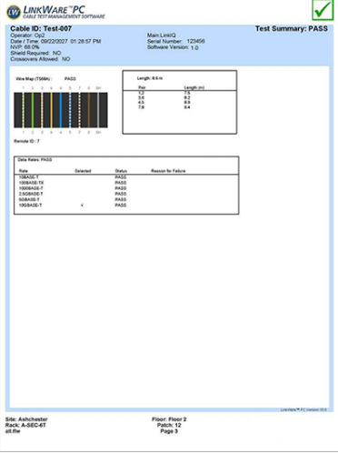 LinkIQ 為其執行的測試提供完整的文檔編製功能。測試儀中可存儲多達1000 個帶有描述性名稱的結果並可調用結果。測試名稱和編號隨每次保存自動遞增(“Annex B-1”、“Annex B-2”、“Annex B-3”等),從而節省順序測試線纜時的大量時間。